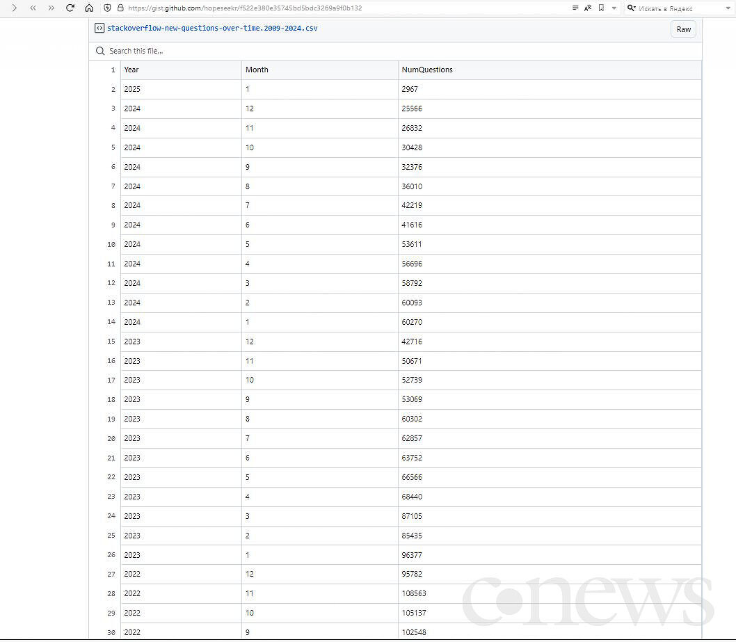 Теодор Смит подчеркнул, что примерно за два года с момента выхода нейросети ChatGPT, которой можно задавать вопросы почти на любую тему, суммарное количество новых вопросов пользователей на Stack Overflow упало на 76,5%. Если в ноябре 2022 г. их было около 108,57 тыс., то в декабре 2024 г. их стало меньше почти на 83 тыс.