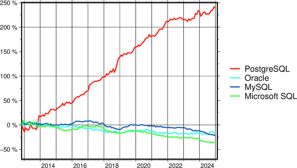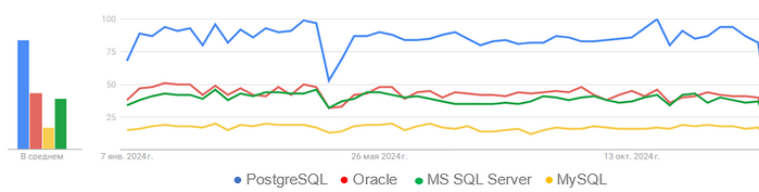 По итогам 2024 года PostgreSQL удержала позиции в абсолютном мировом рейтинге популярности, сохранив 4-е место вслед Oracle, MySQL и Microsoft SQL Server. В России же востребованность PostgreSQL только растет. Согласно аналитике Google Trends за 2024 год, популярность PostgreSQL на 97% выше, чем Oracle (+42% YoY), на 118% — MySQL (+57% YoY) и на 420% — MS SQL Server (+30% YoY).